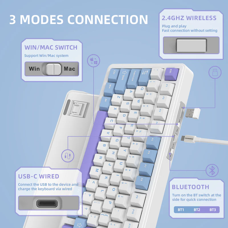 - X85 supports Bluetooth or 2.4Ghz for wireless connectivity,or with the USB-C cable.With Bluetooth,the keyboard responses faster and save more power than the former Bluetooth versions.It is also easily switched among the three modes for efficient multitasking.Included 5000mAh battery ensures a long use.Compatible with Win/Mac system.
