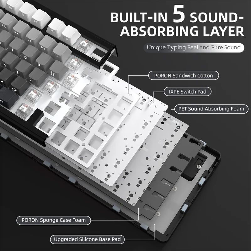 - The new upgrade! Built-in 5 layers of sound insulation cotton between the top panel,switch,PCB,and bottom,including: PORON Sandwich Cotton, 8 × IXPE Switch Pad, PET Sound Absorbing Foam, Sponge Case Foam, Bottom Silicone Pad.Noise is maximally reduced,It achieve an ultimate soft,pure sound and smooth typing experience.
